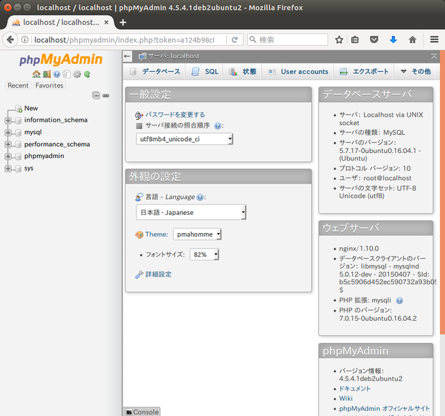 http://localhost/phpmyadmin にログインしたところ。