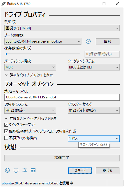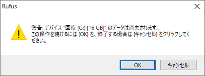 書き込み先(デバイス)と書き込む ISO イメージ(ブートの種類)の設定をしたところがこの画面。デバイスが「回復(G:) [16 GB]」ってなってるのは Windows の回復ドライブに使ってた USB メモリだから。ISO イメージは「選択」ボタンをクリックしてファイルを選択した。他はデフォルトのまま。